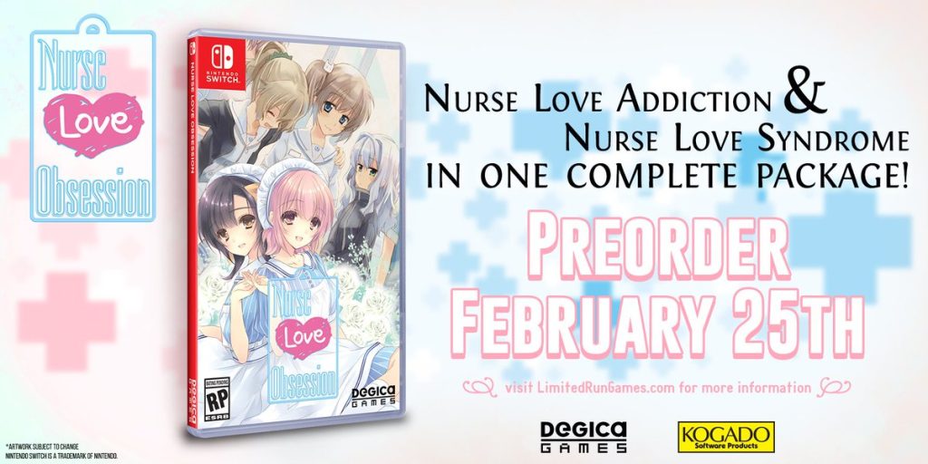 Nurse Love Obsession, um pacote com as visual novels Nurse Love Addiction e Nurse Love Syndrome, está recebendo uma edição física para o Nintendo Switch pela Limited Run Games. Os fãs da série podem esperar pelas pré-vendas a partir do dia 25 de fevereiro no site oficial da Limited Run Games.