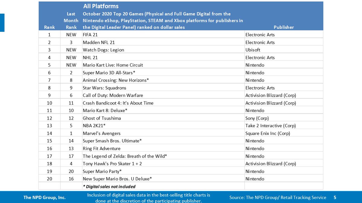 A NPD Group trouxe o mais recente relatório de vendas de software e hardware nos EUA para o mês de outubro de 2020. Para começar, temos os vinte títulos mais vendidos no mês passado, que inclui grandes estreias como Mario Kart Live: Home Circuit, FIFA 21, e Watch Dogs Legion. Pikmin 3 Deluxe não aparece no ranking pois acabou pegando o último dia de outubro para vendas e provavelmente não foi o suficiente para chegar ao vinte mais vendidos.