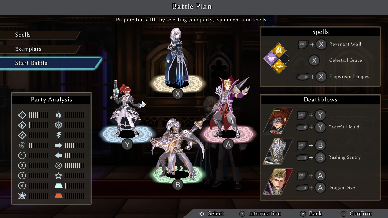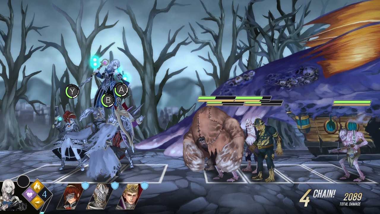 Ok, Rowena e seu grupo de Exemplares. Não sei se vocês conhecem o jogo Indivisible, mas o sistema de combate é o mesmo, onde pode ser descrito como um RPG side-scrolling baseado em ação, um pouco similar aos estilos ATB em JRPG tradicionais. Na batalha, cada guerreiro numa das posições dos 4 botões principais (menos a Rowena, que sempre ocupa o X). Podemos sim escolher a ordem deles, mas não se preocupa, a linha de frente pode ser alterada a qualquer momento. Para atacar, basta apertar o botão correspondente ao Exemplar.