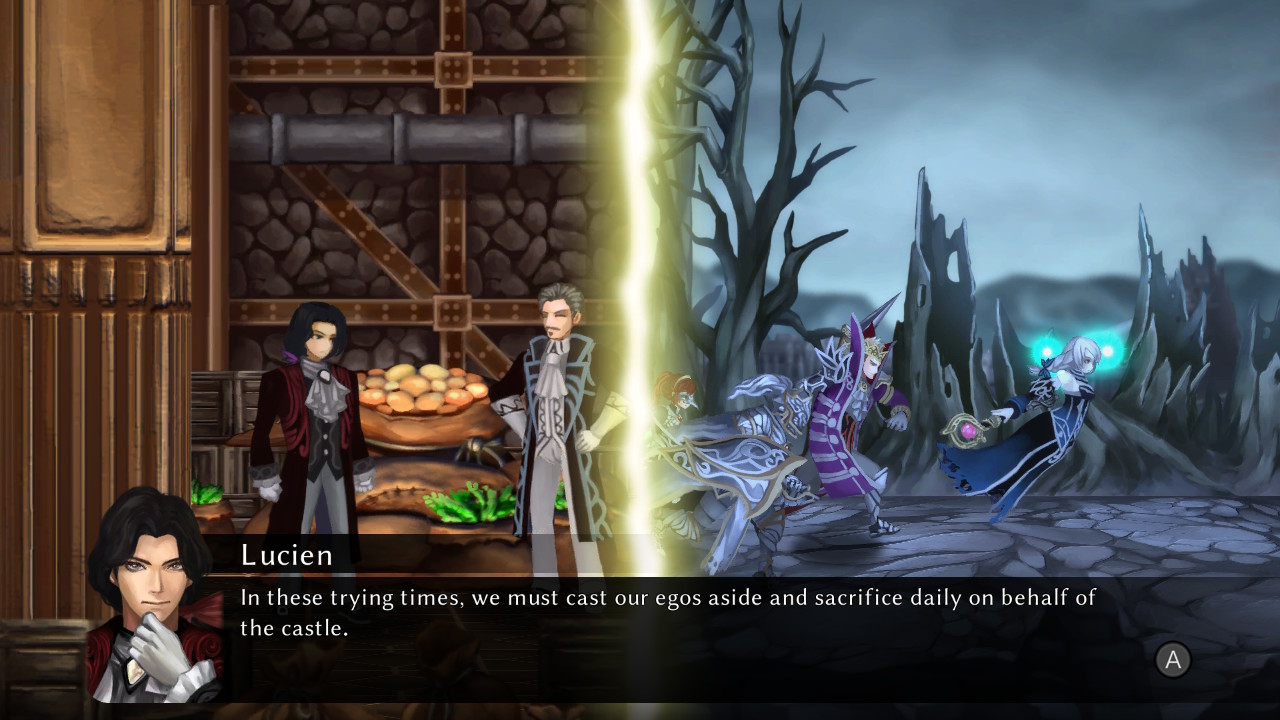 Por mais esquisito que isso pareça, em Fallen Legion Revenants nós jogamos com os 2 personagens ao mesmo tempo. Não no sentido de controla-los simultaneamente, mas que a linha do tempo é a mesma, então a passagem de tempo é igual.