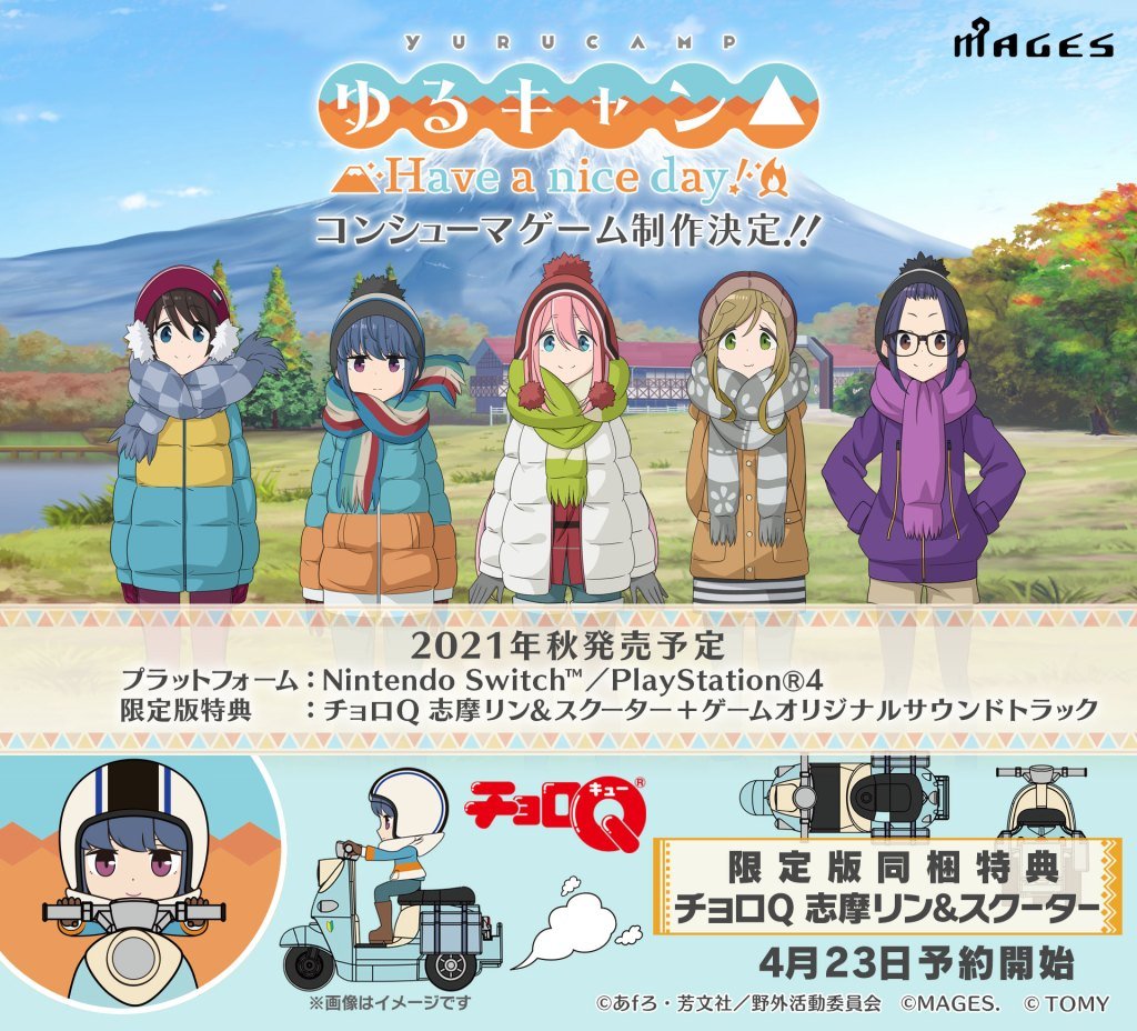 No entanto neste último domingo, durante o evento especial Laid-Back “Stay Tent”, a Mages. revelou que o novo jogo de Yuru Camp se chamará Laid-Back Camp: Have a nice day!, e será lançado para o Nintendo Switch e PlayStation 4 neste outono no Japão. O jogo será disponibilizado tanto em formato físico quanto digitalmente. Haverá também uma edição física limitada que incluirá um brinquedo da Rin Shima em sua scooter, bem como a trilha sonora original do jogo.