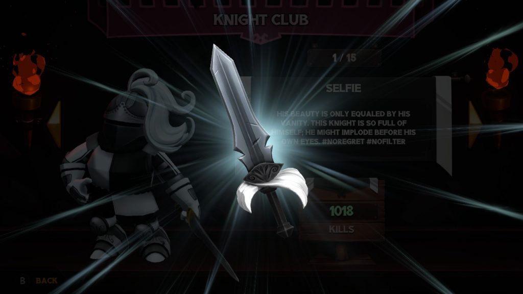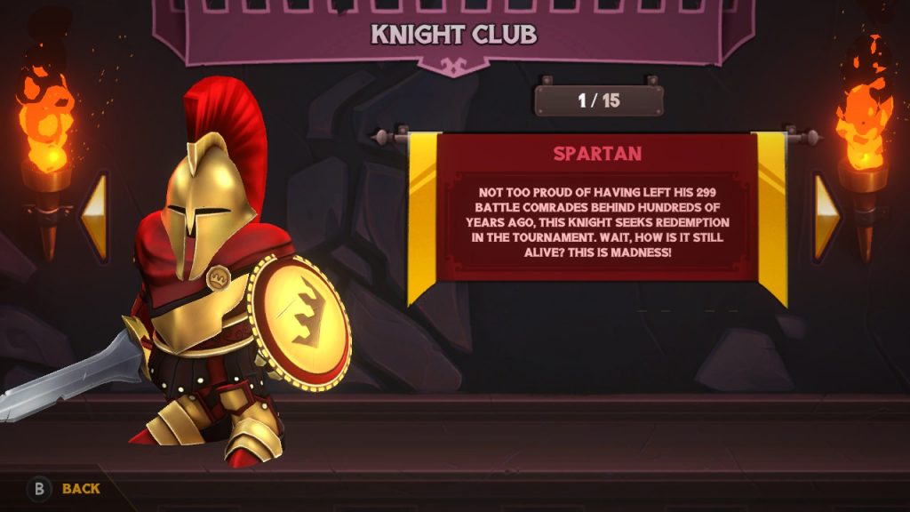Se você viu o trailer, talvez se pergunte: “Mas ué? Como que um jogo assim pode ter personalidade?” Pois é, surpreendentemente ele tem. Cada um dos cavaleiros tem uma ou duas frases de descrição, seja contando sua história, ou fazendo algum trocadilho, e mais que isso, todas as animações do boneco escolhido o representam muito bem. Tem um exibido, tem um atrapalhado, tem um que usa um capacete engraçado, que deixou 299 companheiros numa batalha no deserto e tenta viver com a culpa… (coincidências são meras semelhanças).