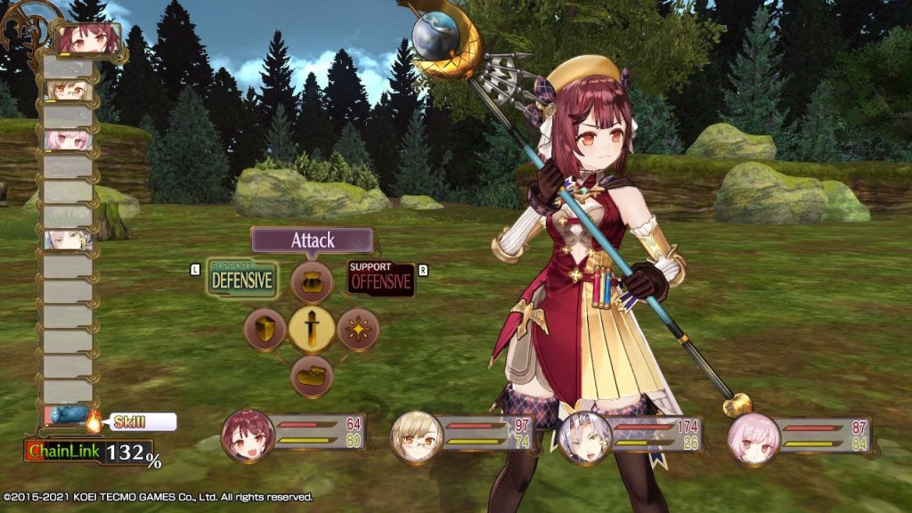 O sistema de batalha de Atelier Sophie é o tradicional Turn Based, com quatro membros na party podendo escolher previamente o movimento a ser realizado antes de ir a ação. O diferencial aqui, que talvez seja característico de quase todos os jogos, é como determinadas ações dependem do posicionamento de personagem na tela — por exemplo: você pode realizar um Special Support quando três ou mais membros da party estiverem na mesma posição, que vai desde golpes adicionais e magias de buff e debuff. Perceba na imagem abaixo há um ícone escrito “Chain Link“, quando ele atinge uma determinada porcentagem, o Special Support é ativado e automaticamente os personagens realizam uma ação adicional durante o turno.