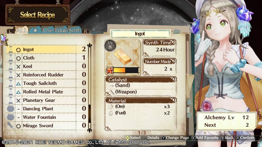 Partindo agora para o coração do jogo (e da franquia), temos o sistema de Synthesis, que é o núcleo de todas as suas ações no jogo. Assim como um sistema de crafting tradicional, no Synthesis liberamos receitas e criamos itens que serão úteis nas aventuras de Sophie, sejam para refinar os equipamentos ou mesmo para dar prosseguimento à história. Todo o andamento do jogo depende da criação de objetos através, até mesmo para estar preparado para batalhas mais intensas. Esse sistema tira quase que toda a dependência do temível grinding, focando mais em criar os melhores itens de suporte e equipamentos mais poderosos.