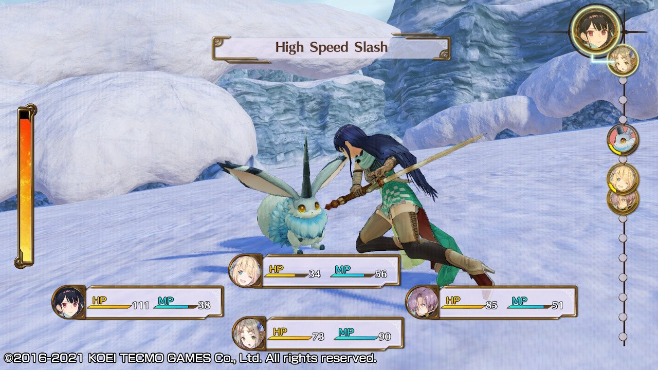 O sistema de batalha se mantém em turnos e curiosamente sendo o último neste estilo antes de irmos para a série Secret. O que se difere dos outros títulos é que ele aposenta o sistema de posicionamento e introduz as “Follow-up Skills“, que realocam alguns personagens na party como suporte daqueles que estão na linha de frente, similar ao que vimos em Atelier Escha & Logy.