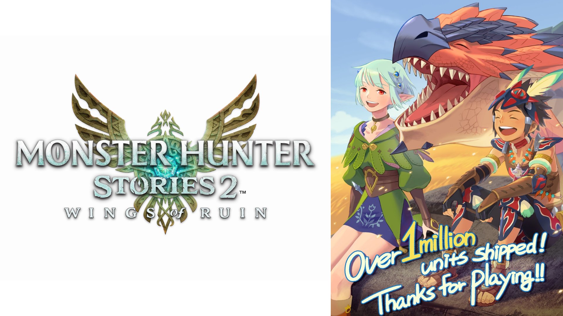 Através de seu site oficial japonês, a Capcom está relatando que Monster Hunter Stories 2: Wings of Ruin já conta com mais um milhão de unidades vendidas no mundo todo; números estes que inclui os envios das versões físicas às lojas e download na eShop e na Steam.