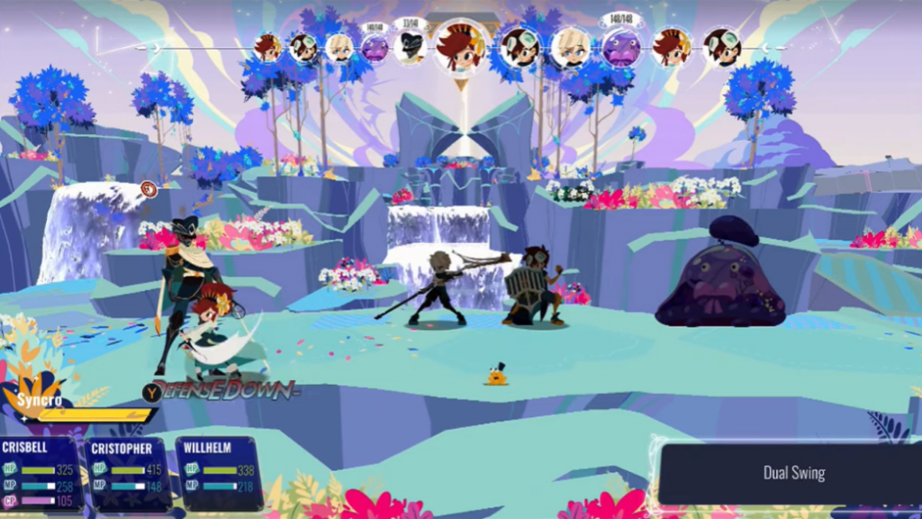 O combate de Cris Tales me conquistou logo de cara. Inicialmente, é um sistema de turnos comum, com 3 personagens no seu time, enfrentando até 6 inimigos. Alguns elementos me lembraram o combate da série Paper Mario, por exemplo: em cada ataque, se você apertar o botão no timing correto, tira mais dano e quando recebe um ataque, se apertar o botão novamente consegue neutralizar parte do dano. É um sistema que na minha opinião funciona muito bem em jogos de turno, adicionando um elemento de ação que recompensa jogadores que estão sempre atentos.