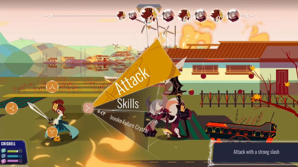 O diferencial é que os poderes de manipulação do tempo de Crisbell podem ser usados durante a batalha. Se o inimigo estiver do lado direito da tela, pode ser enviado para o futuro, caso esteja do lado esquerdo da tela, é enviado para o passado. Cada inimigo sofre um efeito diferente, alguns podem ficar mais fortes no futuro e mais fracos no passado e vice-versa, além de mecânicas como por exemplo, plantar uma semente venenosa no passado e depois trazer o inimigo para o presente onde a semente já realizou o seu efeito. A mecânica é engenhosa, porém, poucas vezes é essencial, da metade para o fim do jogo usei poucas vezes, batalhando normalmente com a maioria dos inimigos.