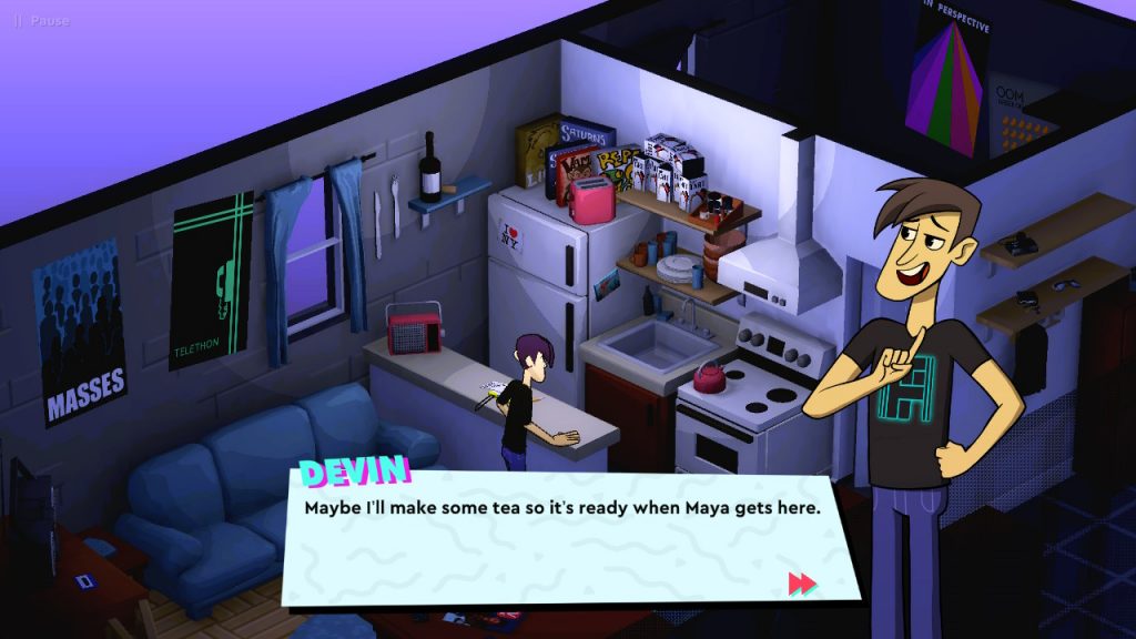 Suas personalidades se refletem nos gameplays de cada um, Devin acaba sendo um personagem point and click, interagindo com o cenário e nos narrando alguns fatos, enquanto podemos controlar os movimentos de Maya, caçando chaves, desvendando labirintos, então ela é bem mais interessante de jogar, porque é a parte realmente dinâmica de Fire Tonight.