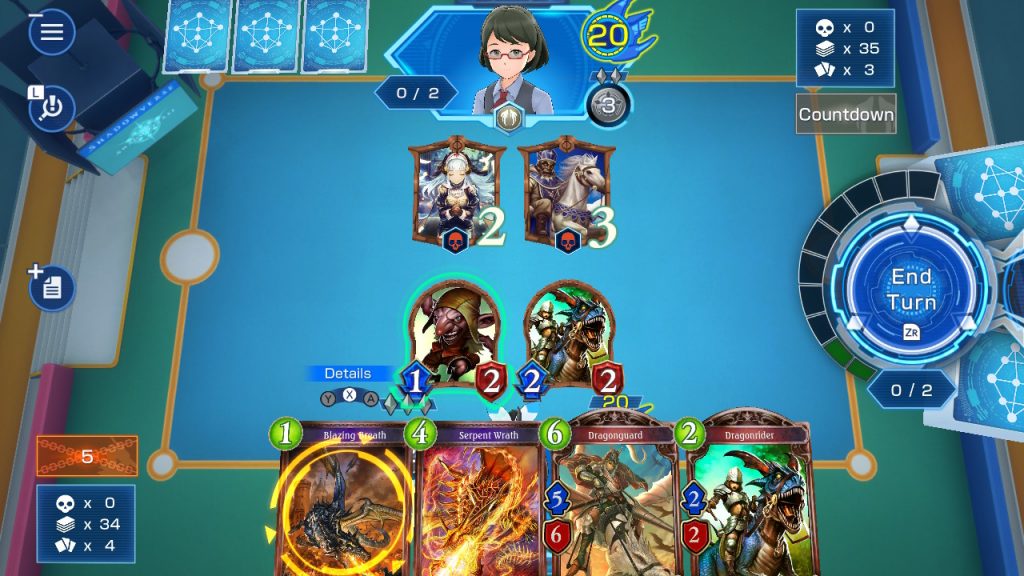 Não existem muitos comandos diferentes (basicamente jogar, atacar e evoluir), e por ser automático, qualquer variação de força já aparece na tela, ou os alvos possíveis dos efeitos já ficam em highlight, são coisinhas pequenas que adiantam a vida e tornam a experiência mais agradável. O único ponto que senti falta é uma visualização da arte da carta durante uma partida, e de sua evolução, afinal, como é tudo bem desenhado, e as artes são fantásticas, eu adoraria ver a carta mais vezes, sem precisar ir no menu, fora da partida, depois de uma cutscene…