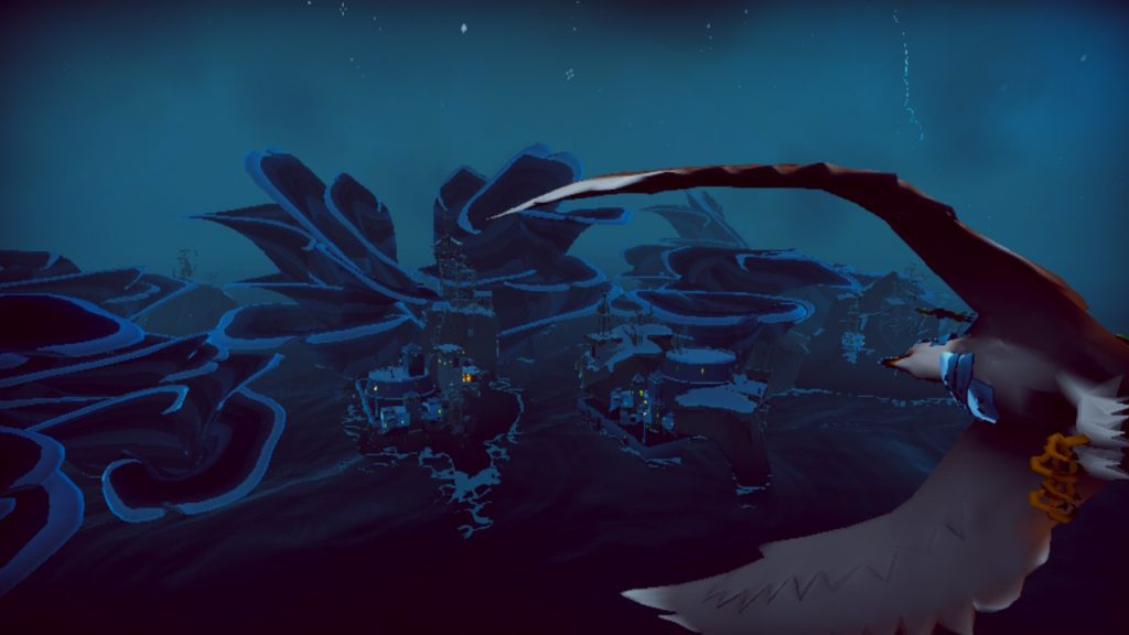 Por eliminação, você já deve ter notado como provavelmente a estética é um dos pontos de destaque de The Falconeer, e você felizmente não está errado. The Falconer assume para si um estilo de arte consideravelmente único, em especial pela ausência de texturas, que são substituídas puramente por cores sólidas, sem qualquer detalhe adicional. Enquanto isso, as estruturas do jogo possuem um estilo beirando a abstração, o que pode até ser consideradas por alguém que não prestou atenção nos textos da história do jogo, já que nestes estão presentes uma quantidade considerável de explicação sobre o que tais estruturas são.