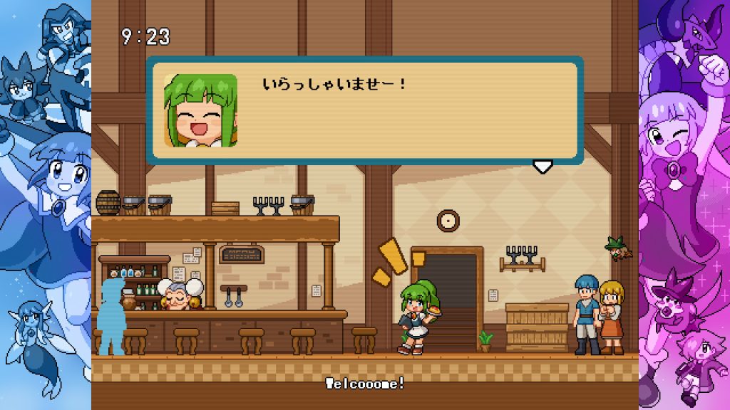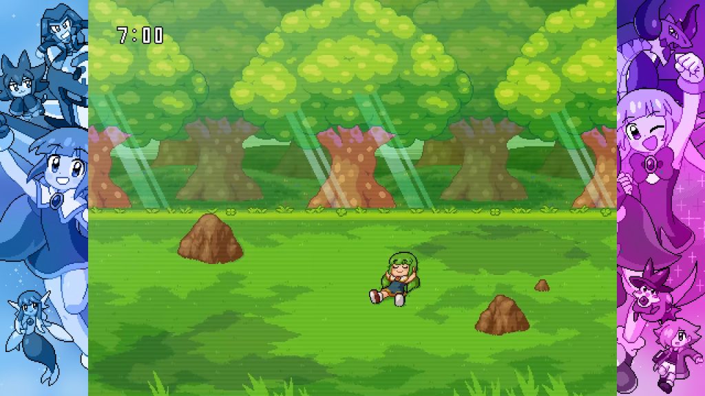 Uma das primeiras coisas que chamou minha atenção no jogo foi seu estilo visual. Visualmente, tudo no game tenta ser um anime infantil, com cores vibrantes, cenários variados e bem bonitos, personagens fofinhas e designs de monstros bem malucos. A pixel art e animações 2D me lembram jogos de navegador dos anos 2000 e esse é um estilo visual que me agrada muito, além de me trazer um senso de nostalgia no mínimo estranho.