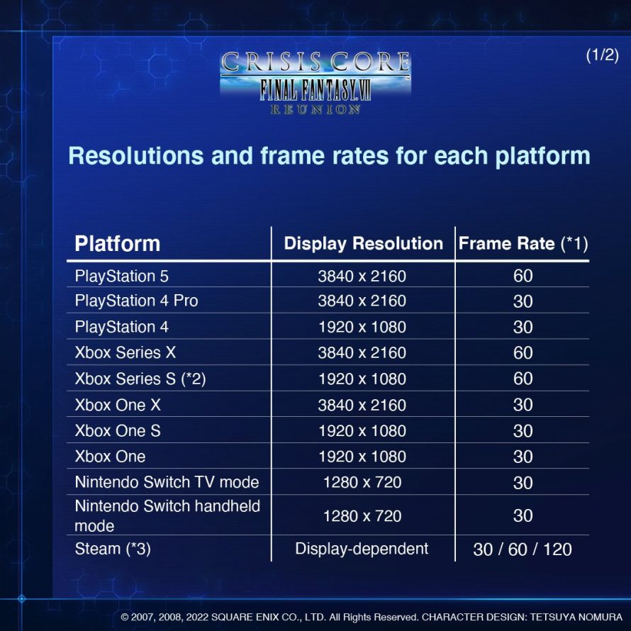 Conforme informado na conta oficial de Final Fantasy VII no Twitter, Crisis Core ─Final Fantasy VII─ Reunion no Nintendo Switch rodará em 720p e 30 FPS, tanto no modo Dock quanto no portátil. Em contraste, as versões old-gen dos consoles da Sony e Microsoft atingirão até 1080p de resolução e 30 FPS; Veja a tabela completa a seguir: