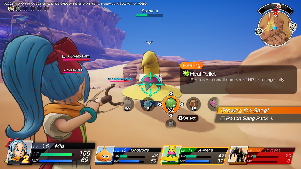 O ponto mais interessante para os combates está no uso do estilingue. Você pode usá-lo a qualquer momento, em tempo real, mudando para câmera em primeira pessoa, e escolher entre vários tipos de munição. Com tiros de estilingue, você pode desde curar seus monstros até atingir objetos pelo cenário e, claro, atacar diretamente os inimigos, inclusive ocasionar efeitos negativos neles, como atordoamento e outros. Essa foi também uma ótima ideia de design de usuário e interface (UX/UI) para a fluidez do acesso a itens consumíveis.