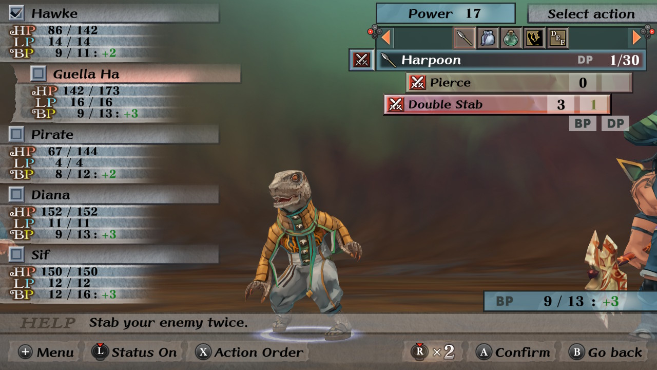 E para tirar total proveito de todos ataques de nossa party temos que entender também os sistemas de durabilidade de armas (DP), que com certos ataques vão se desgastando, podendo ser perdidas se não forem reparadas antes de chegar em 0, e nos Battle Points (BP) que funcionam como uma espécie de “mana” para ataques especiais, e que são recarregadas em certas quantias a cada turno.