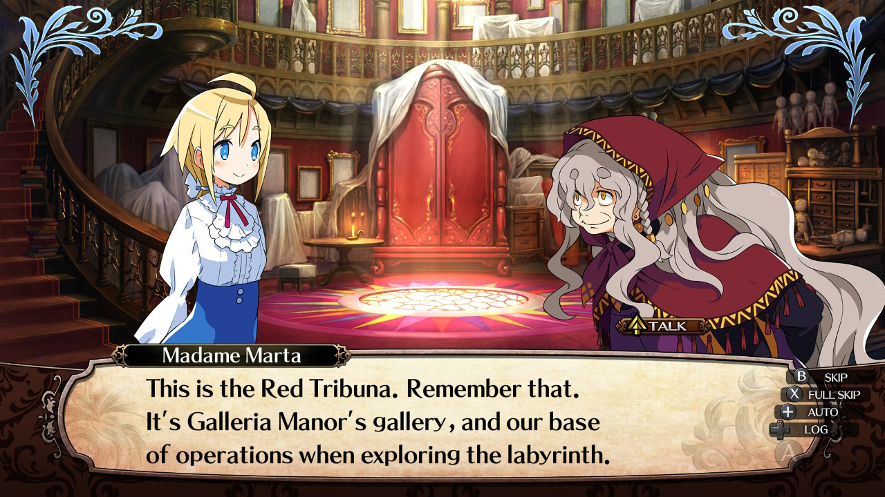 A jogabilidade de Labyrinth of Galleria, no que diz respeito à exploração, segue o estilo clássico de jogos de DRPG. Nos movemos por corredores claustrofóbicos em quadrantes na visão em primeira pessoa, e temos que vasculhar minuciosamente cada canto em busca dos Curios d’art, tomando cuidado com os perigos que lá habitam, como monstros e armadilhas. Fantie é enviado para o subsolo junto dos fantoches de Marta, onde eles farão o trabalho duro pelo Espirito Errante.