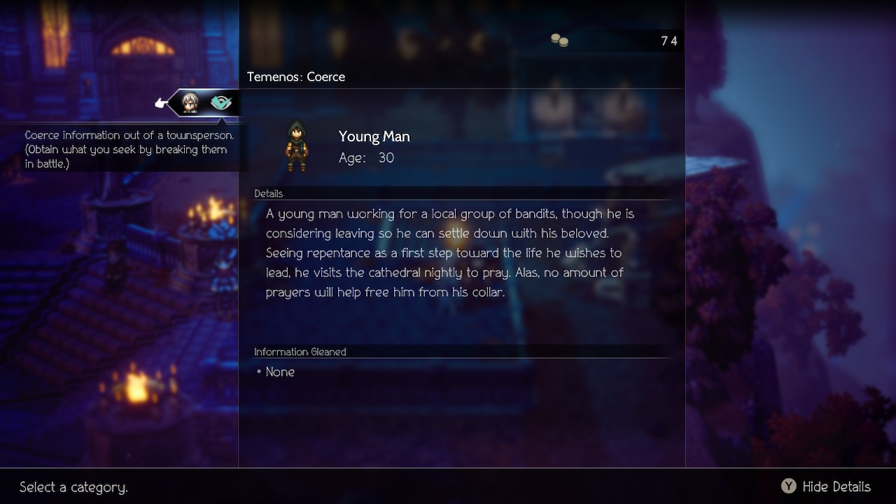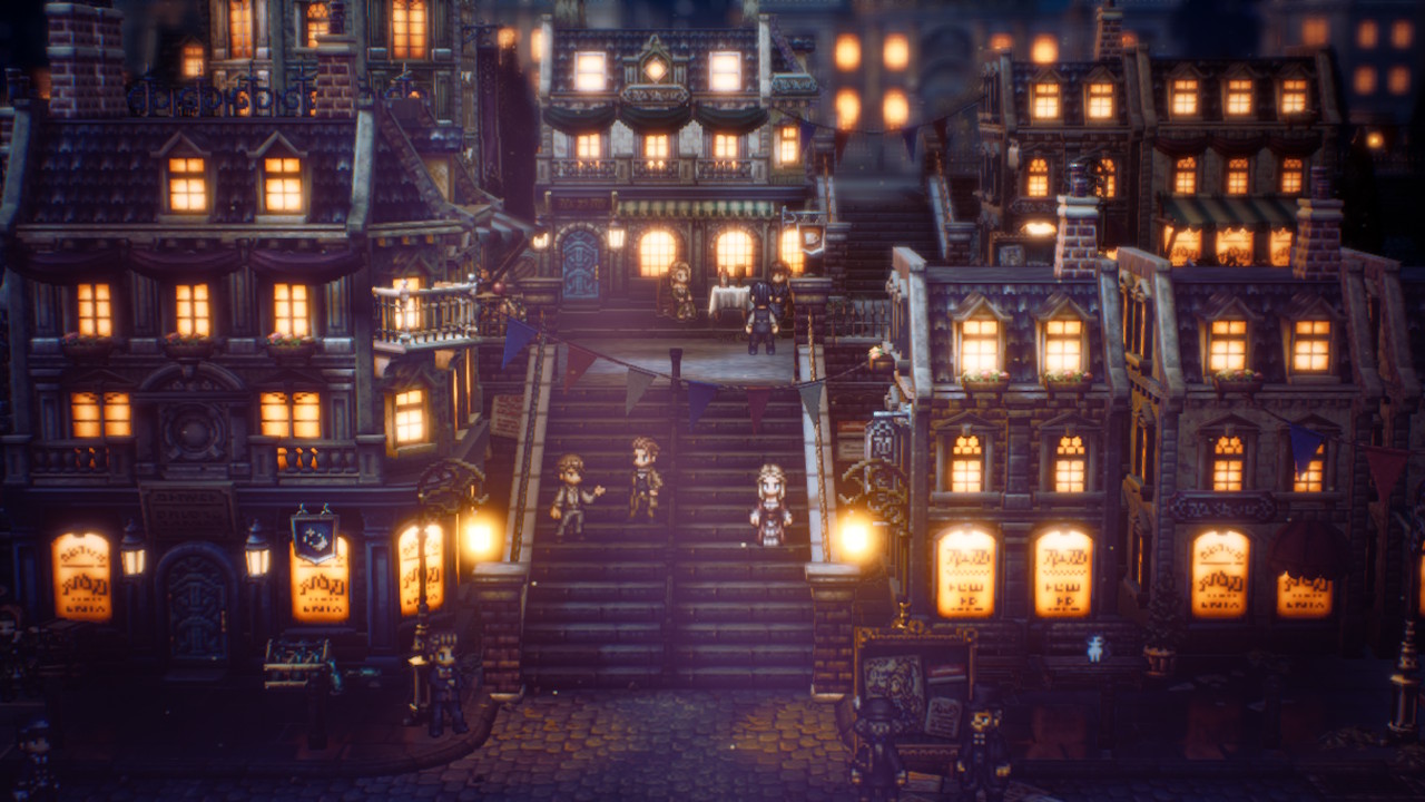 A adição dos path actions secundários também foram muito agradáveis, pois além de aumentar o alcance de ações da sua party, reduzindo a necessidade de ficar alterando sua composição para certas funções, também adiciona muito na personalidade dos viajantes, trazendo um segundo foco em suas interações com outros personagens, e incentiva mais o uso do ciclo dia e noite, com alguns NPCs precisando de um momento específico para poder ter sua interação realizada.