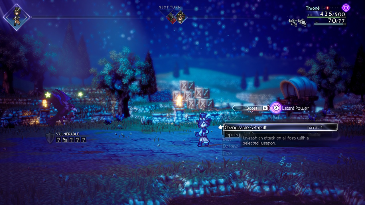 A principal mecânica nova aqui é o Latent Power, uma habilidade exclusiva para cada personagem que é liberada ao tomar uma certa quantidade de dano e/ou derrubar escudos de seus oponentes, e que traz um efeito especial para sua ação que pode mudar totalmente o ritmo do combate ao seu favor, como por exemplo a de Throné, que possui a habilidade de atacar 2x no mesmo turno quando seu especial é ativado. No início eu temia que essas habilidades quebrassem a dificuldade do combate, mas parecem ter sido bem balanceadas para não serem ativadas muito frequentemente, realmente tornando-as parte dos pontos de estratégia das lutas que continuam sendo justamente desafiadoras, em especial nas lutas contra os chefes.