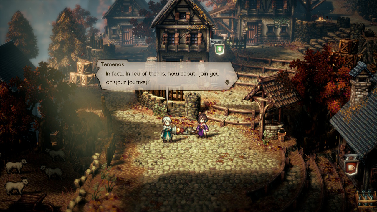 É interessante também notar que dessa vez, pelo menos com Throné, Temenos e Osvald, os desenvolvedores tiveram uma maior atenção em dar motivos e circunstâncias para os novos protagonistas se encontrarem e se aliarem com outros personagens em suas jornadas, onde ao invés de simplesmente os encontrar parados em suas cidades, temos algum tipo de evento em que precisamos auxiliar os viajantes antes que eles contem suas histórias e se juntem a nós.