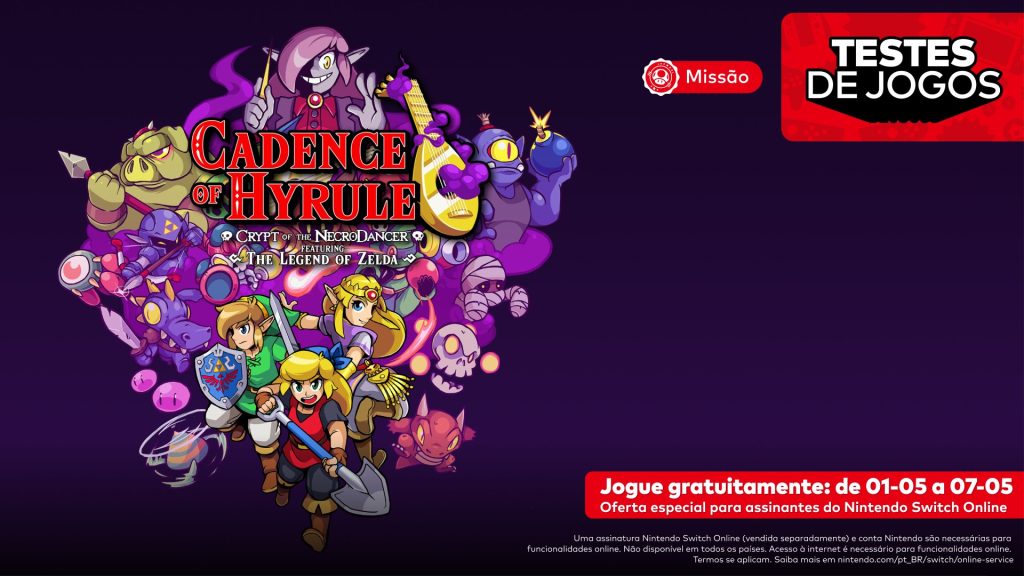 Cadence of Hyrule é um indie de ritmo desenvolvido pela Brace Yourself e um crossover entre The Legend of Zelda e Crypt of the NecroDancer. Ele estará de graça entre os dias 01 e 07 de maio, onde você poderá importar seu progresso para a versão paga se assim desejar obtê-la no futuro. Caso queira aproveitar a oferta, um Free Trial de sete dias do Nintendo Switch Online pode ser resgatado no My Nintendo por algumas Platinum Points.