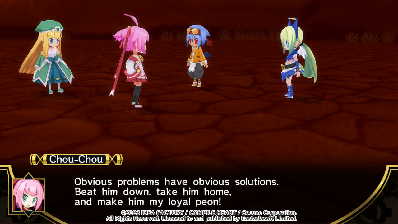 Todos os personagens possuem algum tipo de inclinação que ela pode explorar para tentar conquistá-los e isso é válido até mesmo para objetos inanimados como cristais e postes. Isso é transformado em uma importante mecânica no gameplay em que o jogador deve fazer uma performance escolhendo três ações como “olhar”, “sorrir”, “agir como um bebê chorão”, etc. As melhores opções variam de acordo com o humor do inimigo, mas o mais importante é que Chou-Chou esteja na sua forma correta.