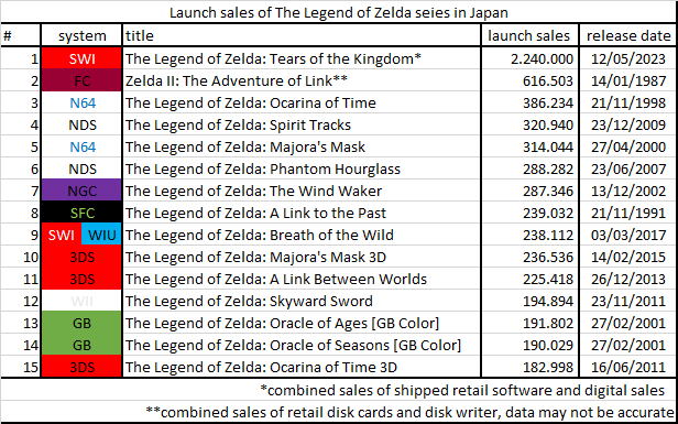 De acordo com Game Data Library, as vendas de lançamento de The Legend of Zelda: Tears of the Kingdom no Japão são as mais altas da série até agora. Ele fez 2,24 milhões — inclui envios no varejo e vendas digitais — em apenas um final de semana, passando o recordista anterior, Zelda II: The Adventure of Link (Famicom), de 1987. A seguir, você confere uma lista das maiores estreias de The Legend of Zelda no Japão e seus respectivos números de vendas: