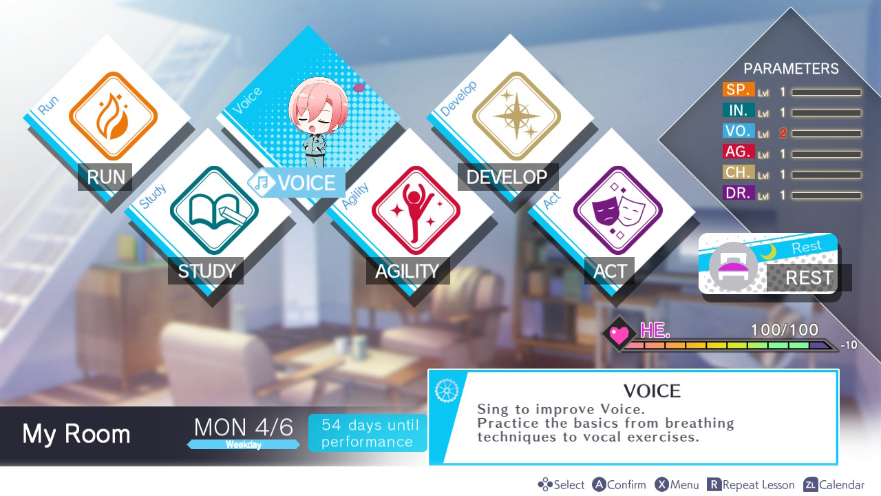 Em vez de ser estritamente uma visual novel, como é o caso da maior parte dos otome games disponíveis no Ocidente, o que temos aqui é um simulador de rotina. Cabe ao jogador escolher como Kisa irá passar os seus dias, treinando em seis frentes de estudo: Espírito, Percepção, Voz, Agilidade, Charme e Drama. Cada um desses parâmetros está associado a um personagem específico que pode se tornar o parceiro mais íntimo de Kisa, e é fácil de notar a relação com base nos padrões de cores utilizados.
