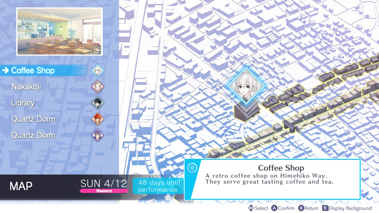 Ao longo do jogo, temos que participar de cinco performances teatrais. Além de assistir aos personagens interpretando os papeis em formato visual novel, temos que realizar sequências rítmicas para os trechos de canto e dança da peça. Os momentos de canto envolvem mover o cursor para os lados acompanhando uma linha na tela, enquanto os de dança exigem que o jogador aperte os botões destacados no momento em que chegam ao canto inferior da tela.