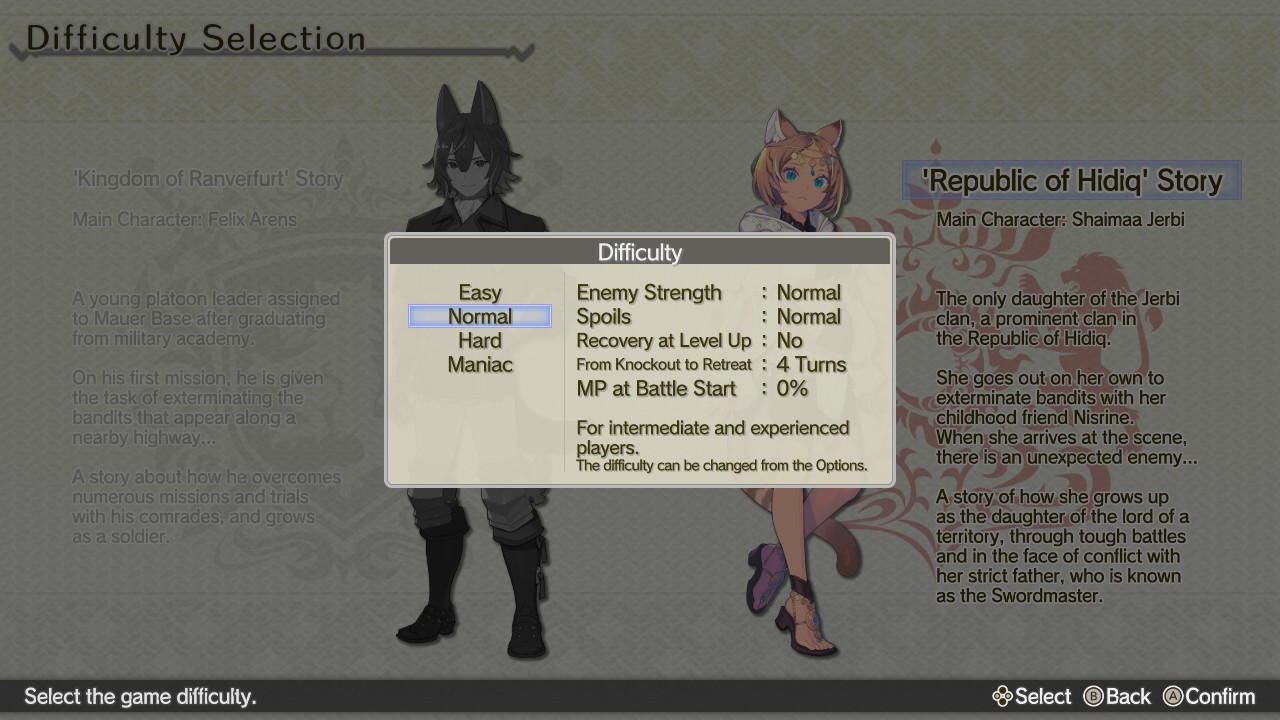 Ainda no quesito gameplay, o jogo conta com múltiplas dificuldades, cujas variações são claramente descritas já no menu inicial. É possível alterar esse fator a qualquer momento fora das batalhas. Além de afetar a força dos inimigos, um dos fatores modificados pela dificuldade é a velocidade com a qual um aliado se retira do combate após ser derrotado. Embora não haja permadeath, uma unidade eliminada dessa forma deixa de ganhar experiência ao final da fase, o que se torna um bom incentivo para jogar bem.