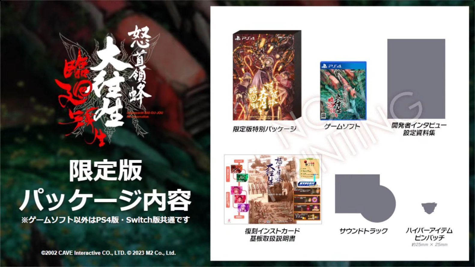 Publicado pela M2, DoDonPachi Blissful Death Re:Incarnation estava como alvo apenas para PS4, mas hoje (10) tivemos sua confirmação para Nintendo Switch, no qual será lançado no dia 07 de dezembro no Japão tanto digitalmente quanto fisicamente, incluindo uma edição de limitada de 10,780 ienes, que inclui os seguintes itens: