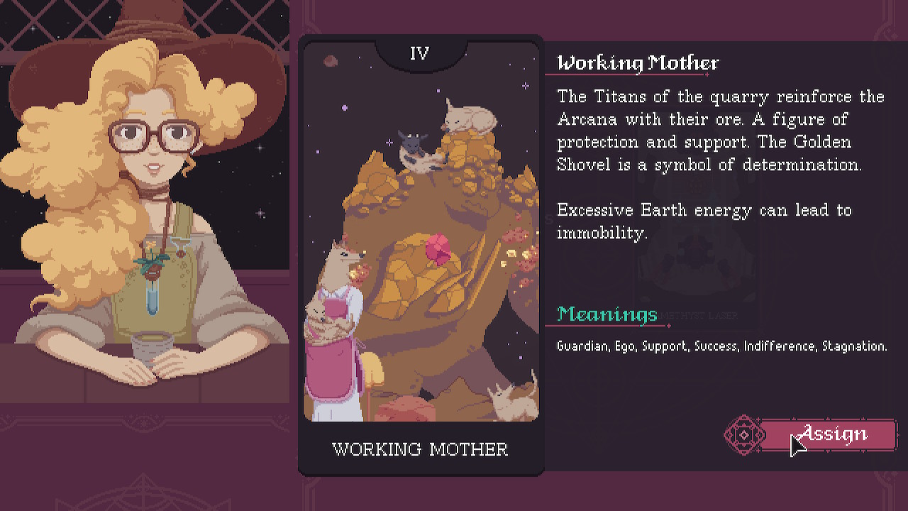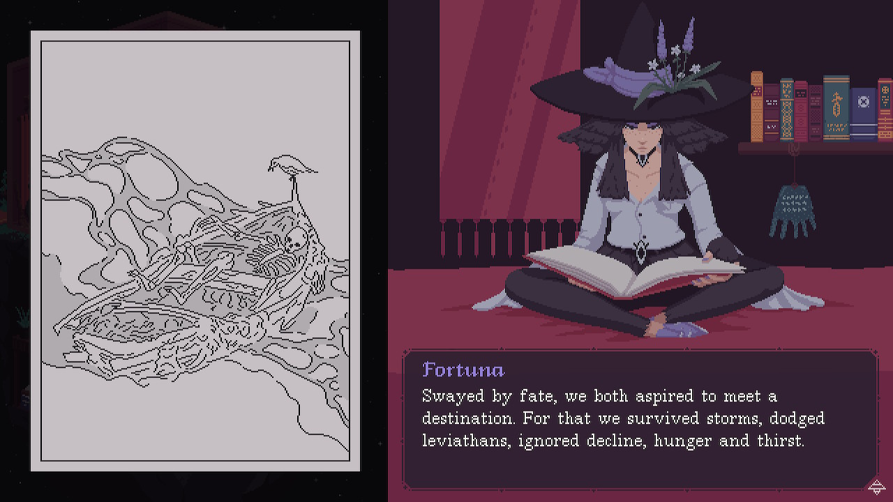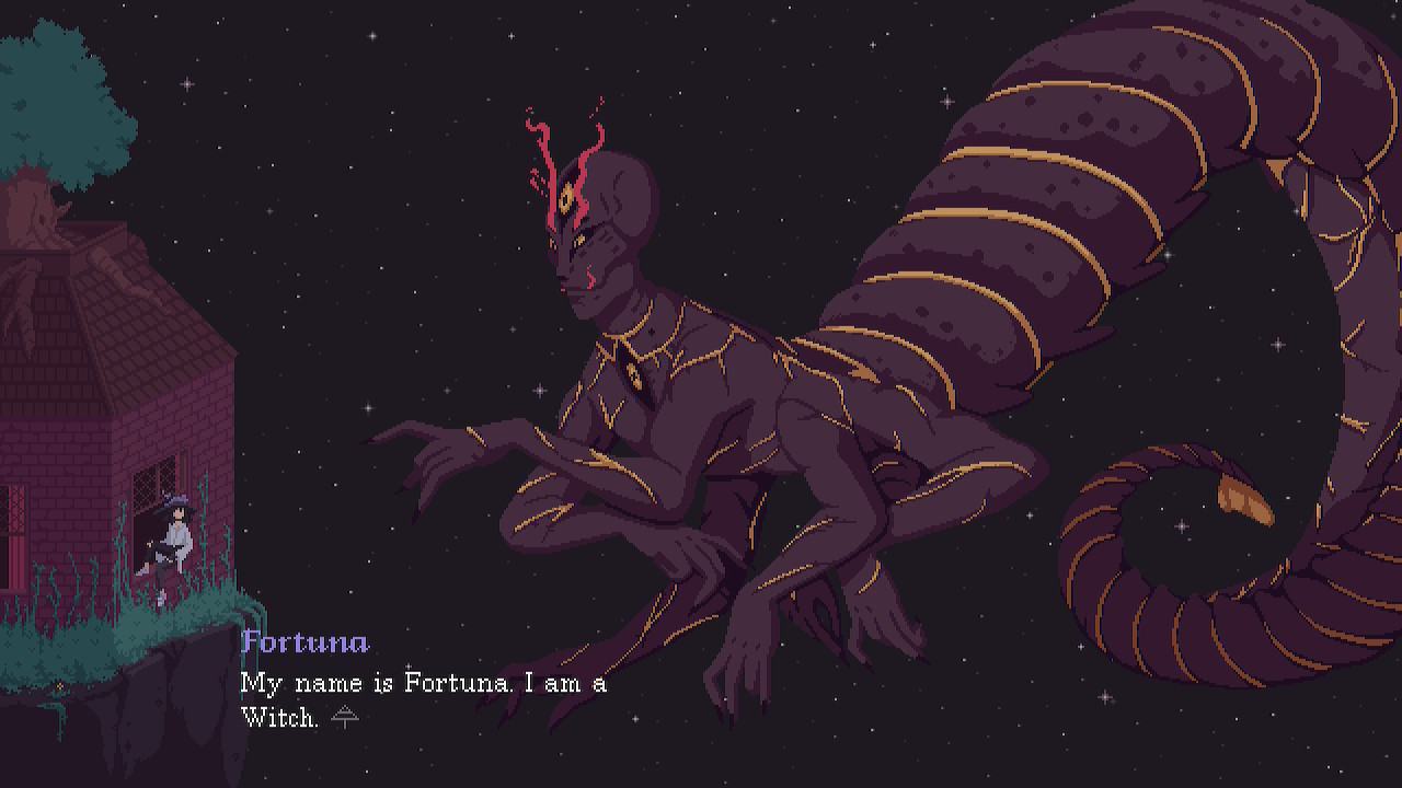 Por último, não posso deixar de citar a belíssima composição visual, que possibilita a criação de cartas instigantes, mas também nos convida a entrar na mente de uma bruxa isolada. Com ilustrações estonteantes em pixel art, podemos encarar personagens e de fato nos comunicar com eles, algo que não é sustentado apelas pelo texto. E a música, que sofre alterações com personagens em tela, apresenta arranjos da mais fina ordem, fazendo a solidão ser habitada por uma profusão de cores e melodia.