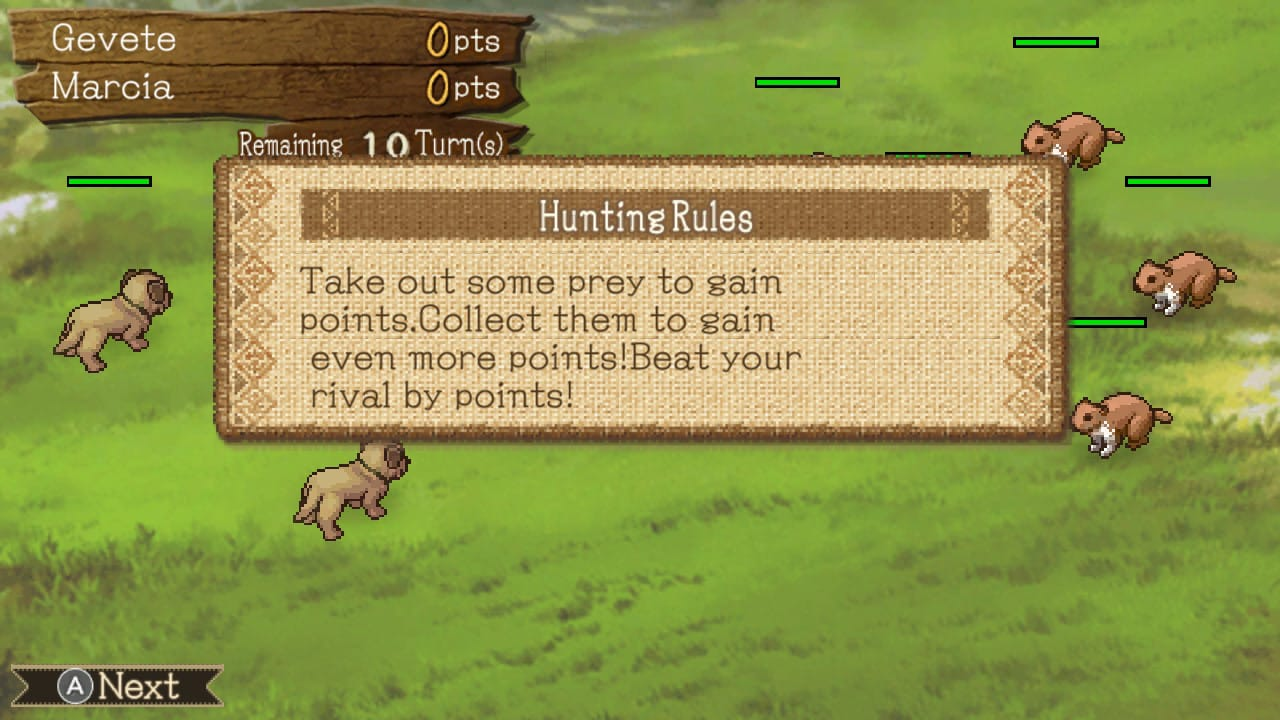 Quando o jogador não está lutando contra os controles da fazenda, tentando colocar a cerca no lugar certo, ou desistindo e nunca mais tocando nela, como foi meu caso, ele pode progredir até desbloquear caçadas, pequenas e simples batalhas em turnos nas quais combatemos os pequenos animais, que são apresentados como pragas na região; quem sabe, no espírito do jogador, não role uma vendeta pelas periódicas vezes que alguns desses animais aparecem para estragar a fazenda.
