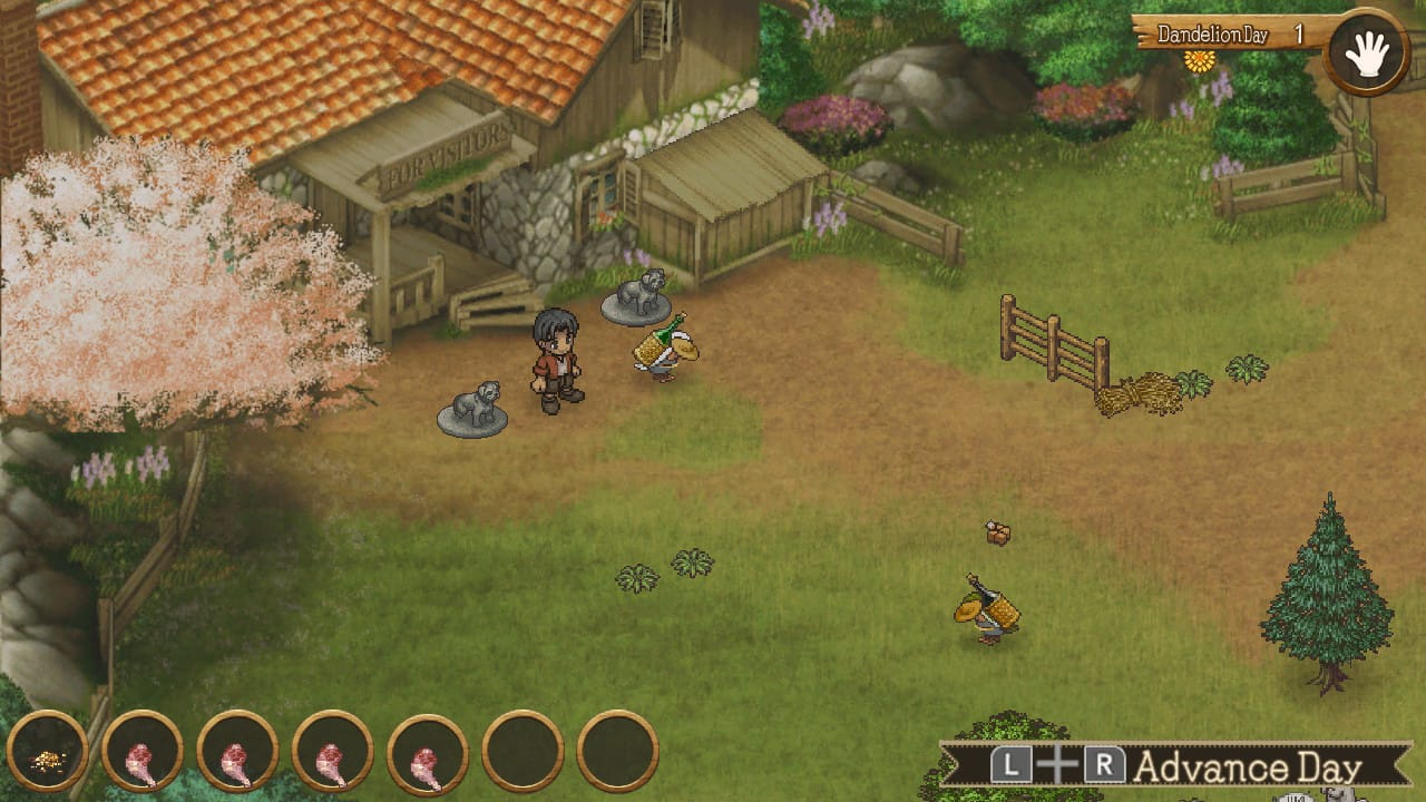 Os recursos, por sua vez, só precisam ser jogados no chão, das sementes até a comida de seus animais, e tudo irá se resolver; alguns objetos podem/precisam ser cortados em períodos certos para sermos recompensados com os itens corretos, e itens corretos você fará questão de ter, pois no quinto dia o jogador pode finalmente ir até a feira, basicamente um menu de loja, onde todo o loop do jogo finalmente começa.