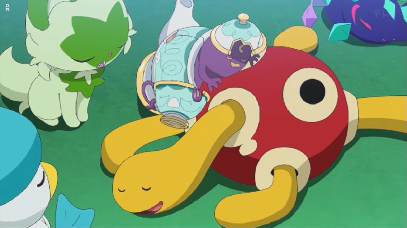 Dito isso, é óbvio que não rola nada sério e no fim todos curtem a companhia um do outro comendo berries e tomando o chá que o Polteageist produz. Liko e Roy inclusive tão olhando a festa de longe e concluem que aquilo é uma reunião em segredo onde apenas os Pokémon participam, e eles os deixam à vontade sem serem notados.