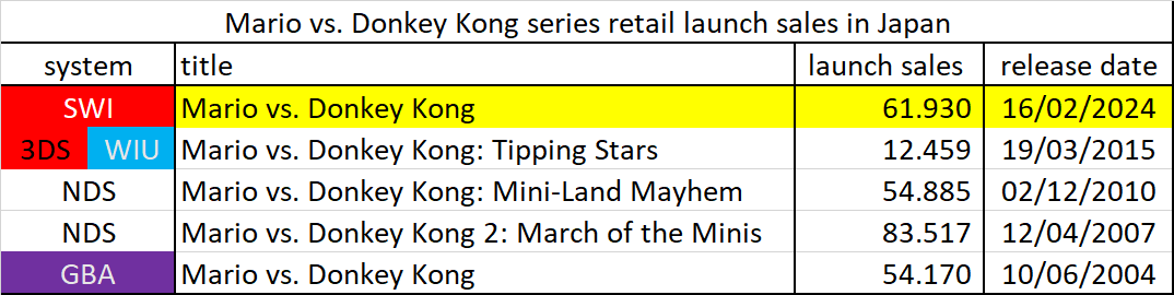 Com estes números, a Game Data Library nos diz que o remake de Mario vs. Donkey Kong viu a 2ª maior estreia da série até então, passando inclusive os números iniciais do título original de GBA. Mario vs. Donkey Kong 2, do Nintendo DS, ainda é, em grande margem, o título com a melhor estreia. Lembrando que estamos falando apenas de vendas no varejo.