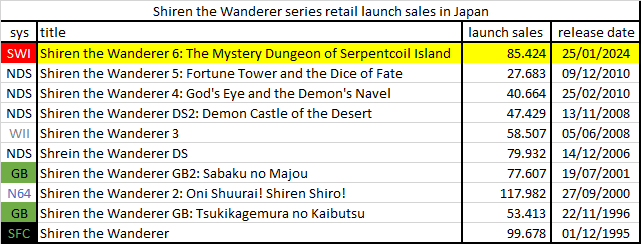 A seguir, temos uma compilação com os números de vendas de estreia para cada lançamento original de Shiren the Wonderer: