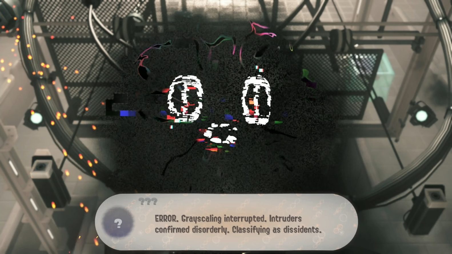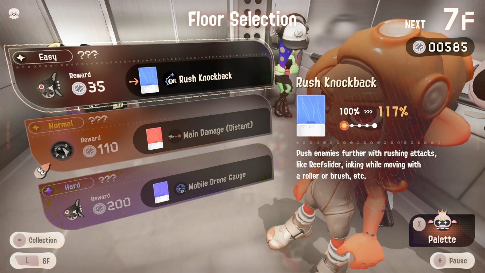 Agora, acho que devo começar dizendo que Side Order é, em essência, um roguelite. E quero deixar bem claro até a última sílaba. Cada um dos andares do Spire deixará escolher entre três missões diferentes, cada uma com dificuldades variadas: Fácil, Normal, Difícil e Rigoroso. Cada missão tem um objetivo diferente que você deve seguir para passar para o próximo andar. E é aqui que o elemento roguelite entra em ação. Cada andar concederá à você um chip colorido que lhe dará um bônus aleatório na Paleta, acrescentando recursos de combate ao seu Pearl Drone, ou aumentando a capacidade de sua arma, desenvolvendo seu personagem à medida que você avança.