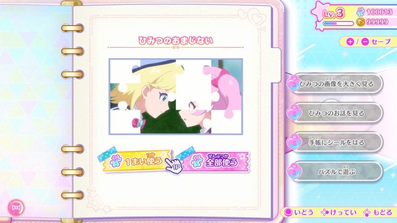 Conforme jogamos os dois modos, também liberamos “pedaços de segredo”, que desbloqueiam fotos de situações do anime. Uma vez desbloqueada, é possível assistir a cena (com voz em japonês) e depois jogar um quebra-cabeça para montar a imagem novamente quando quiser.