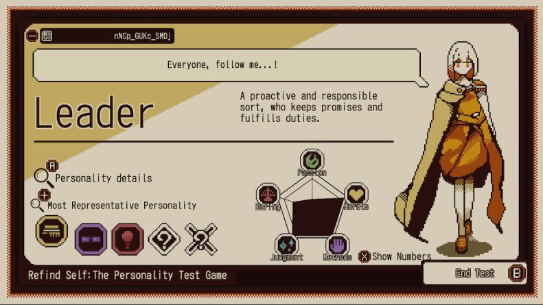 Talvez você esteja se perguntando o quão certeiro o teste de personalidade do jogo é, não é? Bom, eu nem sei dizer para ser honesto. Tenho a impressão de que com esses tipos de teste a gente sempre tenta se encaixar nos detalhes descritos, as pessoas são absurdamente plurais e colocar toda a personalidade em uma só definição beira o impossível. Inclusive o game sabe disso, já que no final você recebe 5 personalidades que lhe descrevem, desde a que mais se manifesta em você até a mais distante.