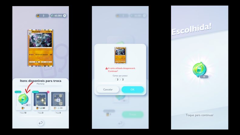 Quem começa o processo já deve mandar uma carta que gostaria de trocar para que o amigo avalie se quer ou não. Apenas cartas dos boosters Dominação Genética e Ilha Mítica podem ser trocadas. Além das cartas promocionais, cartas de duas e três estrelas estão fora da lista, então não é possível trocar nenhum bicho por aquele Mewtwo ex dourado que o seu amigo conseguiu obter 3 vezes.