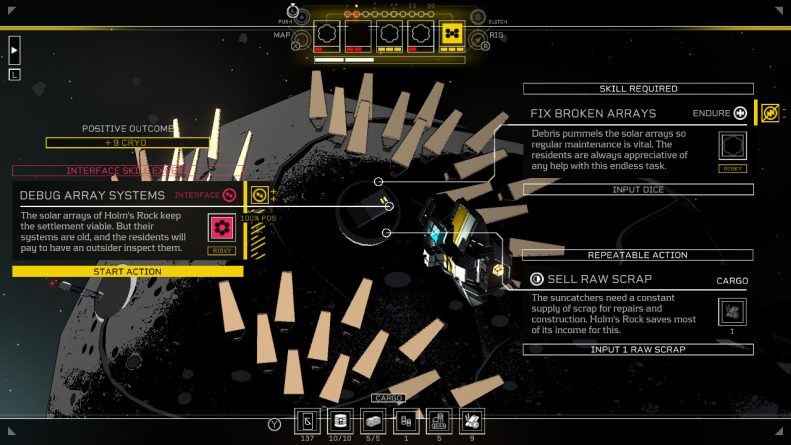 A jogabilidade mantém a estrutura do primeiro Citizen Sleeper, e com razão—afinal, “não se mexe em time que está ganhando”. O jogo funciona como um RPG narrativo baseado em dados: a cada dia, um conjunto de rolagens é gerado, e o jogador escolhe como alocá-las nas tarefas e desafios que encontra.