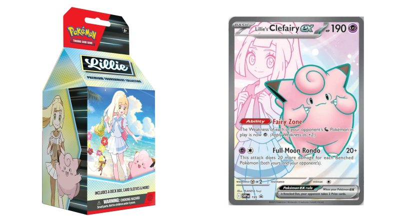 Ao começar pelo “Lillie Premium Tournament Collection”, este dá continuidade às famosas “caixinhas de leite” que a Copag nunca lança no Brasil. Ele será lançado no dia 25 de abril, destacando a carta promo full art da Lillie’s Clefairy ex em uma arte alternada da que virá na coleção Amigos de Jornada.