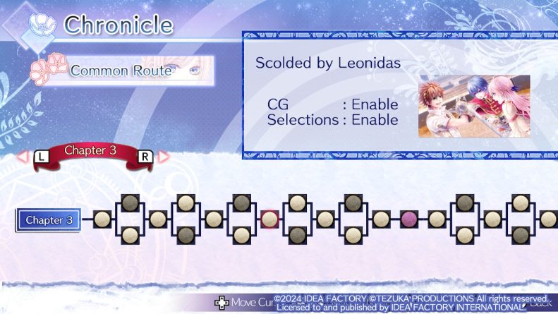 O sistema de Chronicle é ótimo e o flow chart é muito interessante, principalmente para aqueles que gostam de ver 100% do jogo, desbloqueando todas as rotas, diálogos e CGS. A parte ruim disso tudo é que jogo acabar por não deixar muito claro o que precisa ser feito para avançar organicamente, sem que seja necessário um sistema a parte.