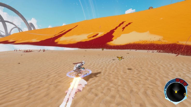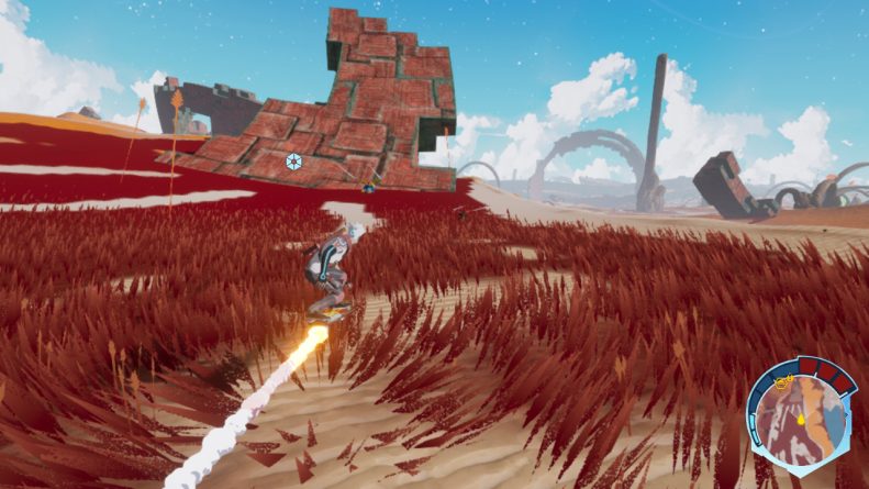 Na exploração, possuímos uma mecânica que lembra muito Tony Hawk’s Pro Skater, série que tem retornado aos holofotes com seus remasters, porém consideravelmente diferente. As áreas deste planeta são desertas e o level design é cheio de pequenas rampas com marcações de cor para que o jogador entenda que são para pular e fazer manobras.