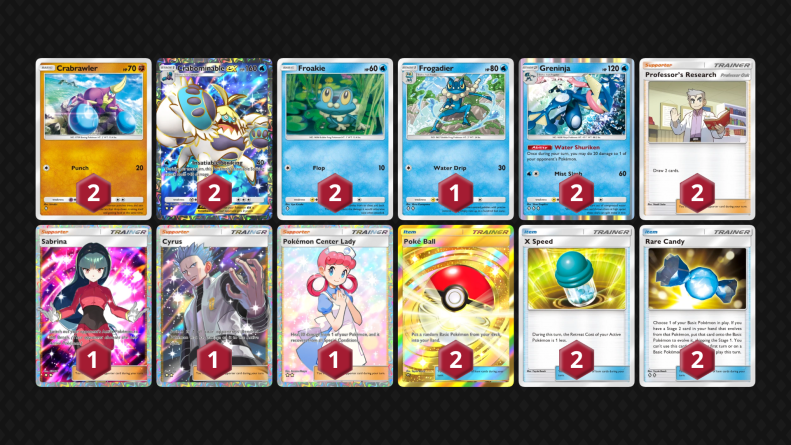 A ideia principal do deck é ter Crabominable ex como batedor principal e ir complementando os danos com Greninja, além de ser um ótimo atacante secundário. Sabemos que na prática o setup não funciona tão rápido assim mas, ele fica consideravelmente mais rápido com o uso de Doce Raro, principalmente ao se comparar com suas versões com Articuno ex e Gyarados ex – Apesar de com Gyarados ex ser mais difícil achar slots para alternativas por ser uma lista mais fechada. Com a ajuda de Greninja é possível que consigamos colocar os 100 pontos de dano por uma energia com o Crabominable ex, já que ao atacar pela segunda vez, recebe um buff e podemos complementar como snipe de Greninja para o mesmo.