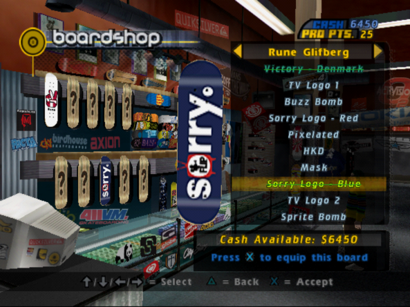 O próprio skate também é altamente customizável, com a possibilidade de criação de um design próprio com logos e artes selecionáveis ou escolhendo um dos designs das marcas disponíveis. Posso colocar no meu skate um shape da Flip pro model do Rune Gilfberg, temático de sua video part no clássico “Sorry” lançado em 2002 em VHS, que até hoje é um dos meus vídeos de skate favoritos, juntamente com Mind Field, da Alien Workshop.