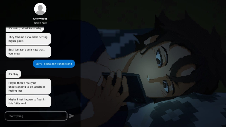 Ao esperar o metrô, fazemos o que todo jovem adolescente com acesso a smartphone faz, olhamos nossas redes sociais e conversamos com nossos amigos. O jogo cria um feed fictício, do qual você pode interagir, curtir, compartilhar e, em certas postagens, comentar. Alguns personagens até comentam se você curtir ou compartilhar alguma postagem. É uma maneira muito interessante de conhecer os interesses e as pessoas que circulam a vida de Mark, e também, como ele leva a própria vida. A história acontece tanto nesses momentos quanto em qualquer outro diálogo entre personagens ou eventos acontecendo em tela.