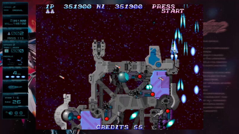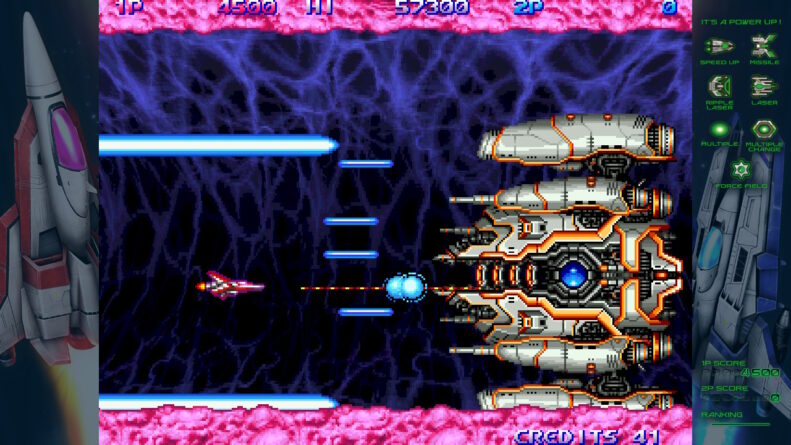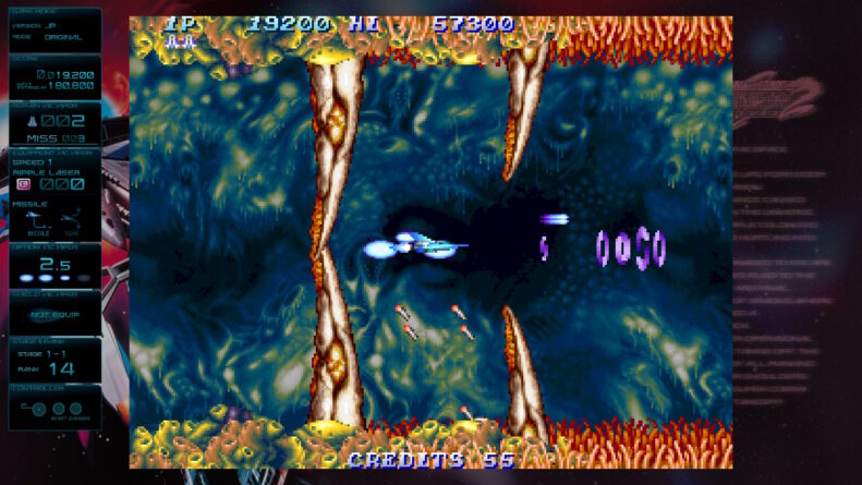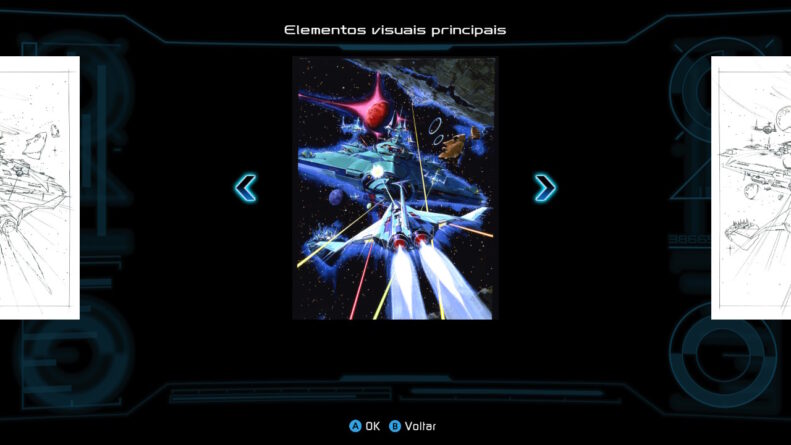 Além disso, como parte do pacote, temos uma galeria com vários conteúdos, como keyarts, materiais de design das naves e inimigos, documentos da produção e trilha sonora. Esse tipo de adição é uma forma ótima de conhecer um pouco mais do processo, mas os documentos estão todos em japonês e não há sequer um texto descritivo para explicar melhor. Todos os jogos clássicos possuem também manual atualizado in-game e um guia que permite ver as animações dos inimigos e quantos pontos cada um deles vale.
