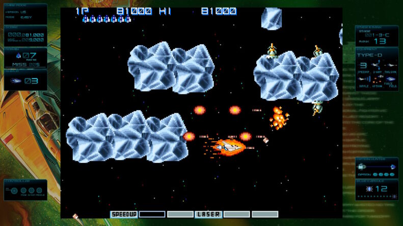 Além de jogar o “Modo original”, que é o balanceamento da época, há um “Modo fácil” e até um “Modo invencível” para quem quiser apenas passar pelos jogos do início ao fim, o que pode ser útil para ver o layout completo do jogo antes de desafiá-lo. Temos também o “Modo treino”, que permite escolher pontos específicos das fases para explorar, sendo uma ferramenta muito mais útil para que o jogador consiga aperfeiçoar suas habilidades.