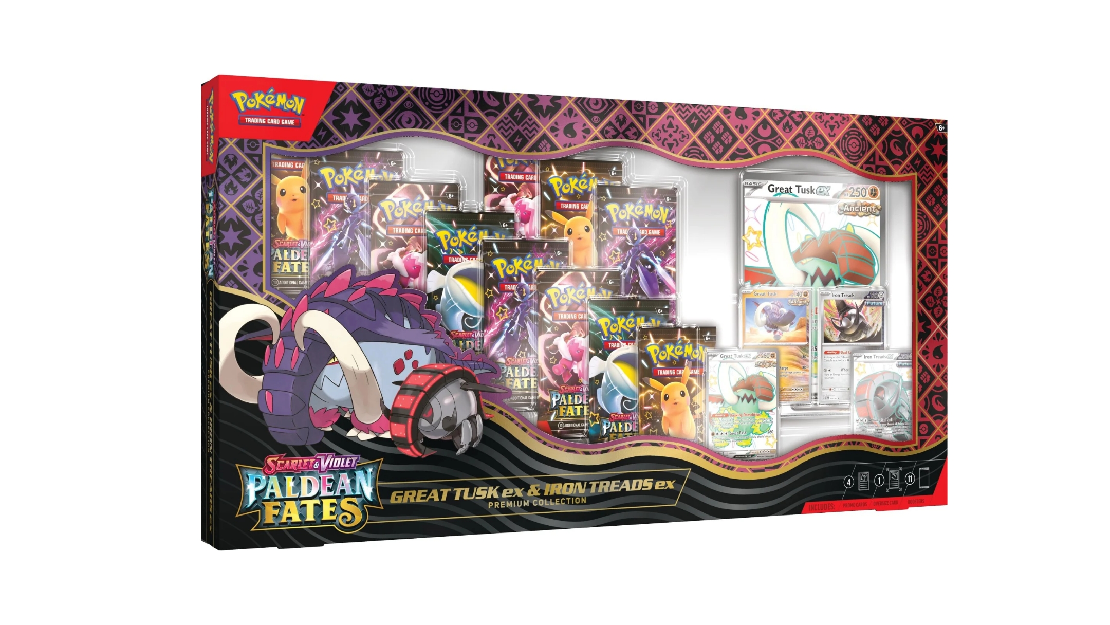 “Paldean Fates Great Tusk ex & Iron Treads ex Premium Collection” parece ser uma versão dois-em-um das boxes Coleção Presa Grande ex Brilhante e Coleção Trilhos Férreo ex Brilhante lançados no início de 2024.